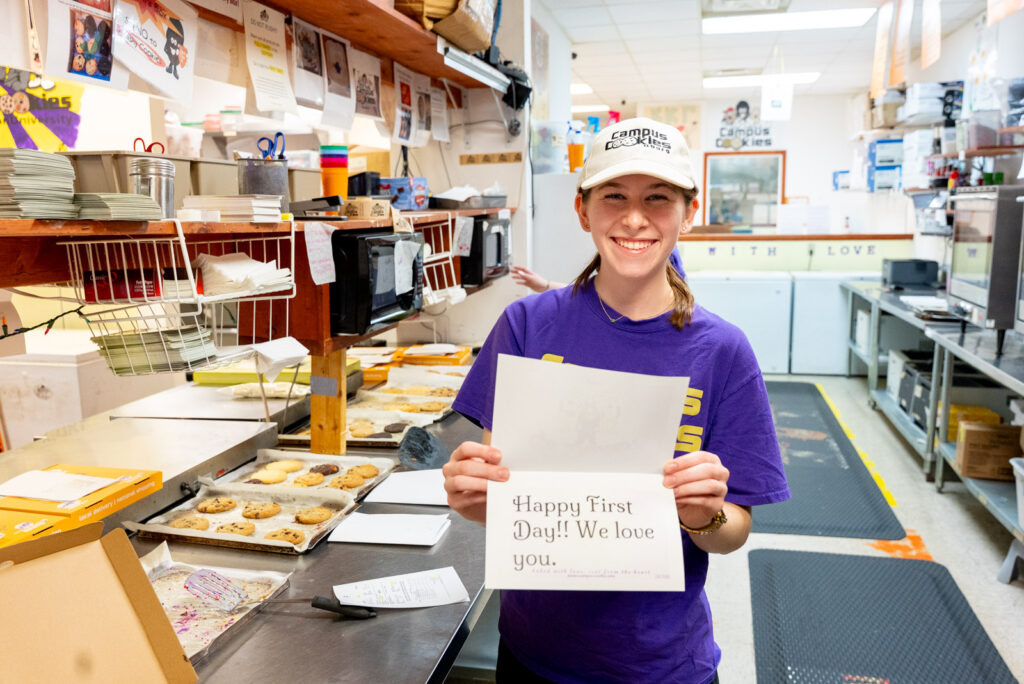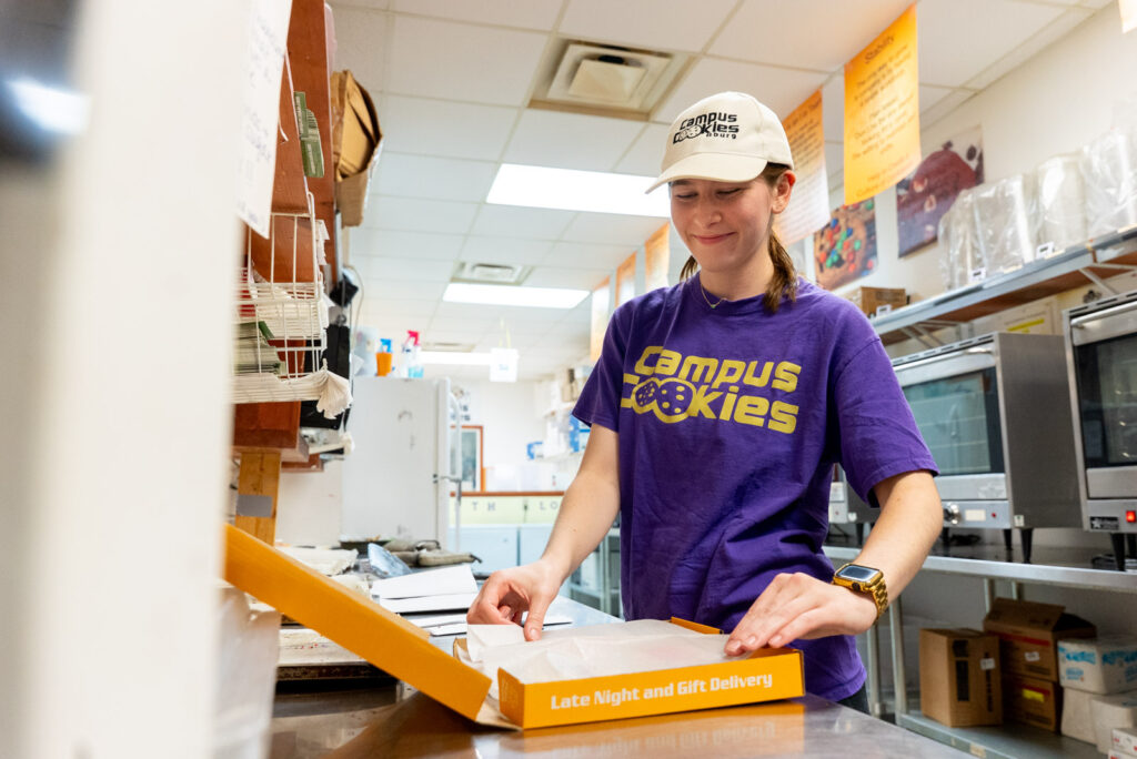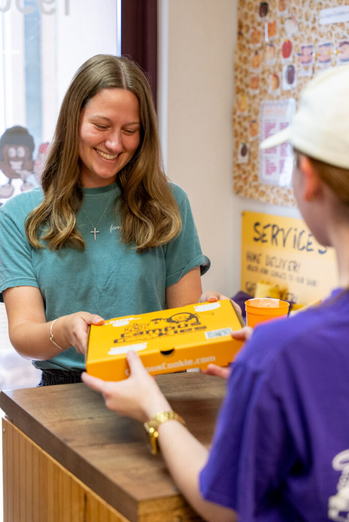 In addition to cookies, the shop also serves ice cream, pretzels, cinnamon rolls, and cookie cakes. This variety makes it a go-to spot for birthdays, big/little reveals, or even a simple late-night craving. Their gifting service allows families and friends to send personalized cookie packages to students, complete with notes, themes, or custom designs.