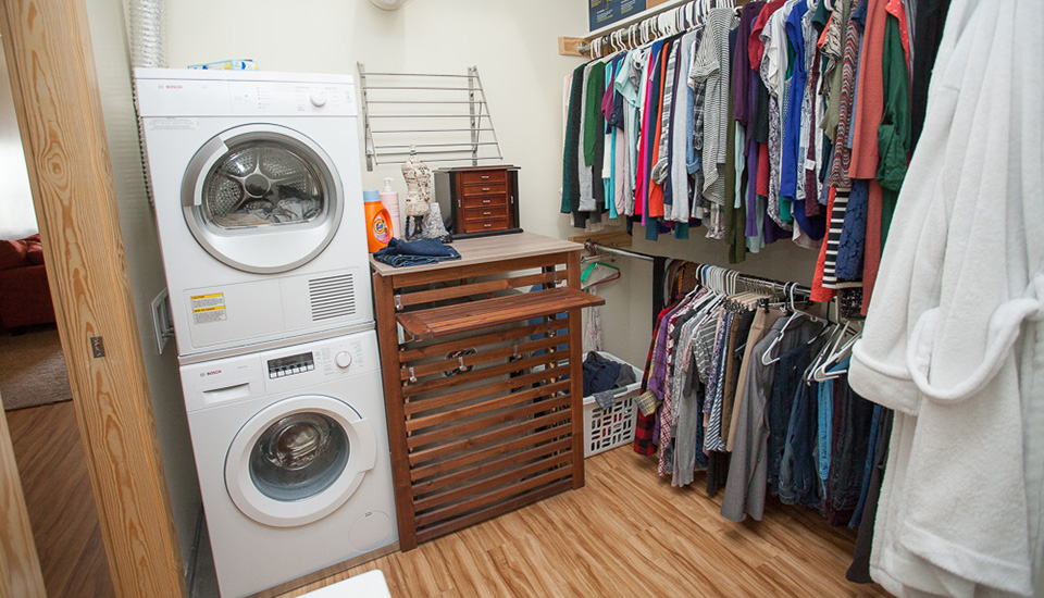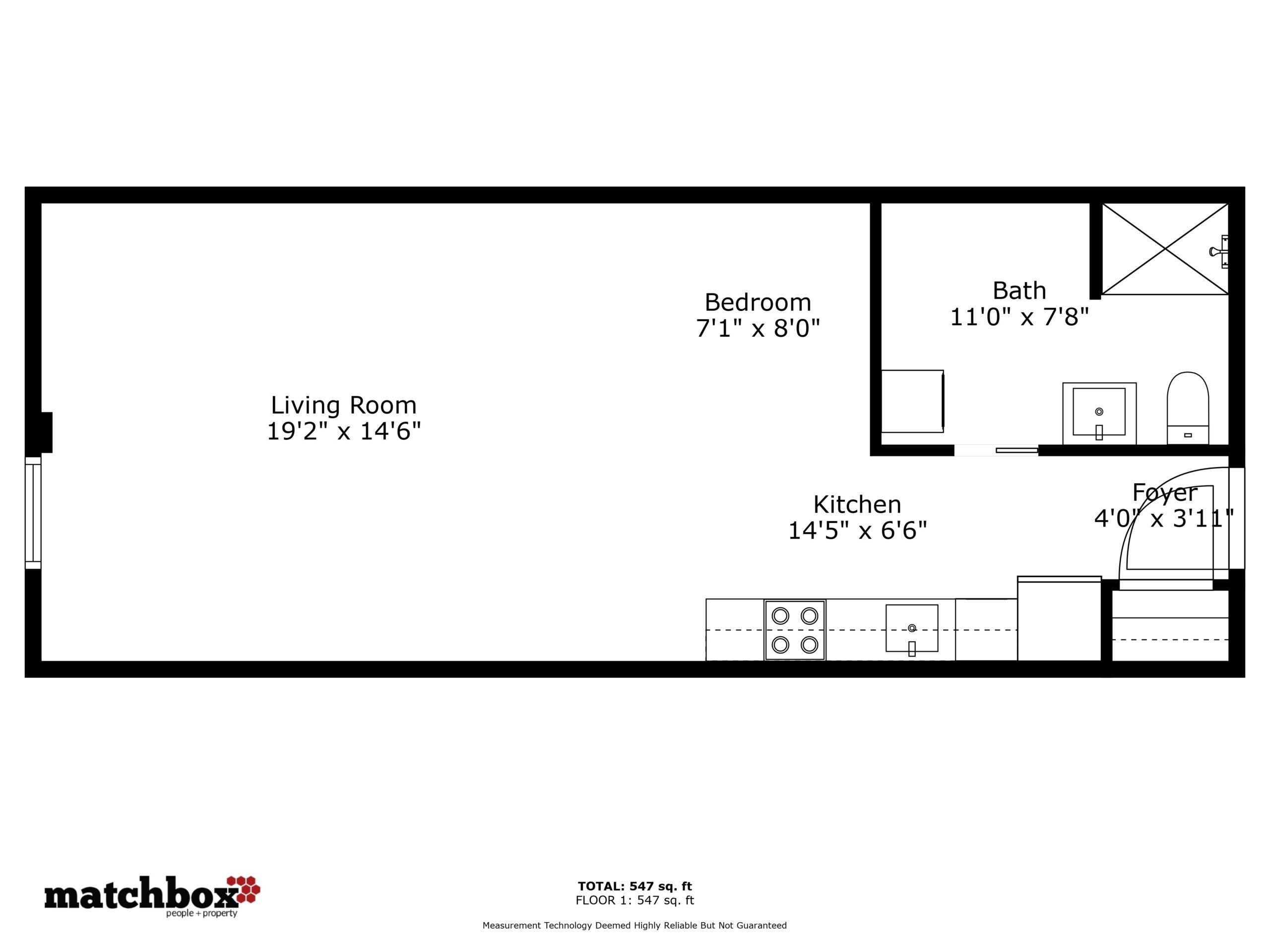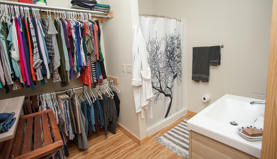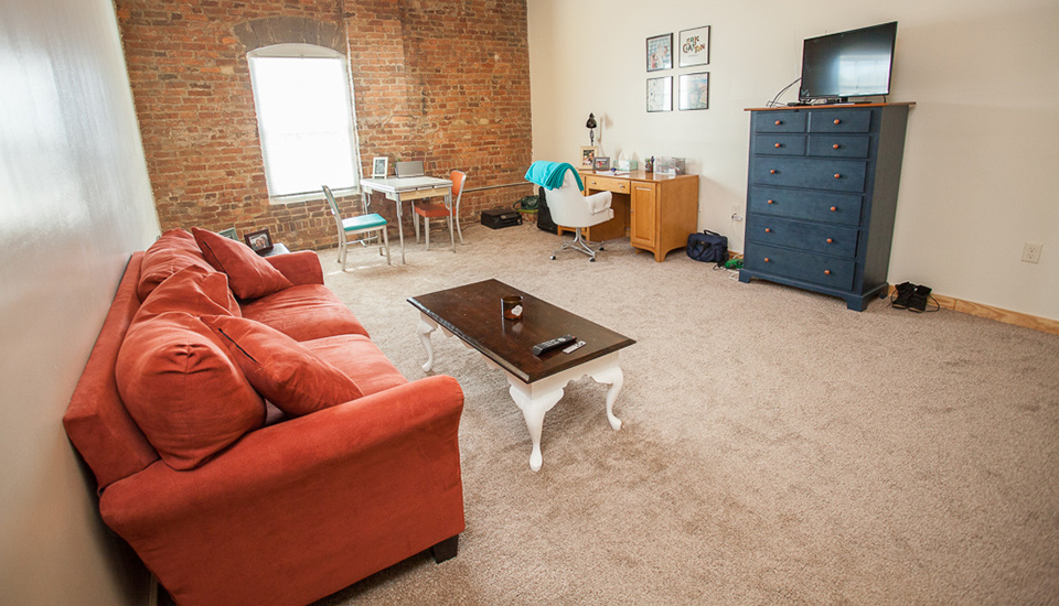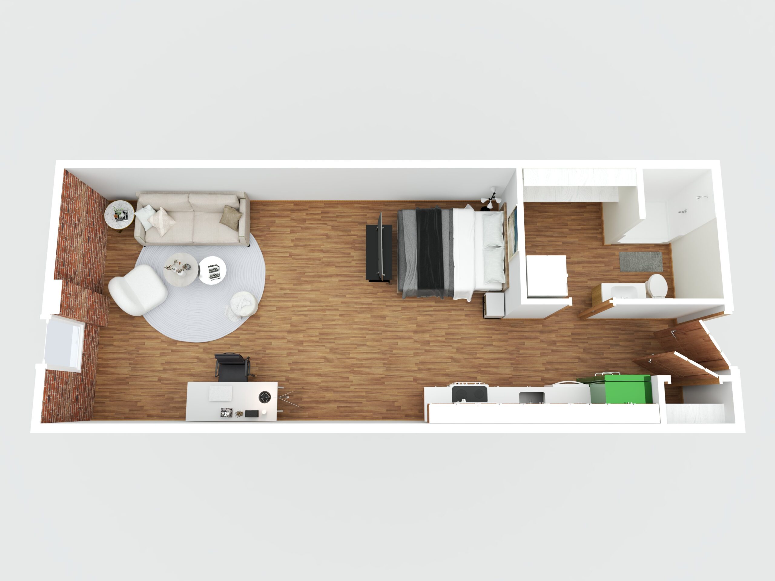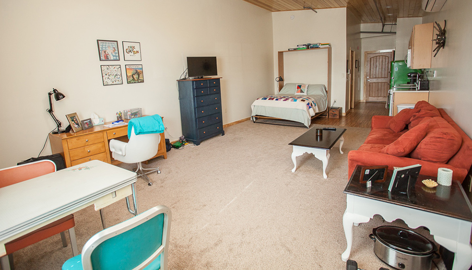 This studio features high ceilings and views facing South over Water Street. There is a queen sized Murphy’s bed… you just need to bring the mattress. While you are laying in bed, looking out your window, you will notice the beautiful, original brick wall plus the skylight in the ceiling. In the bathroom, there is a solar tube to help save on those electric bills!!