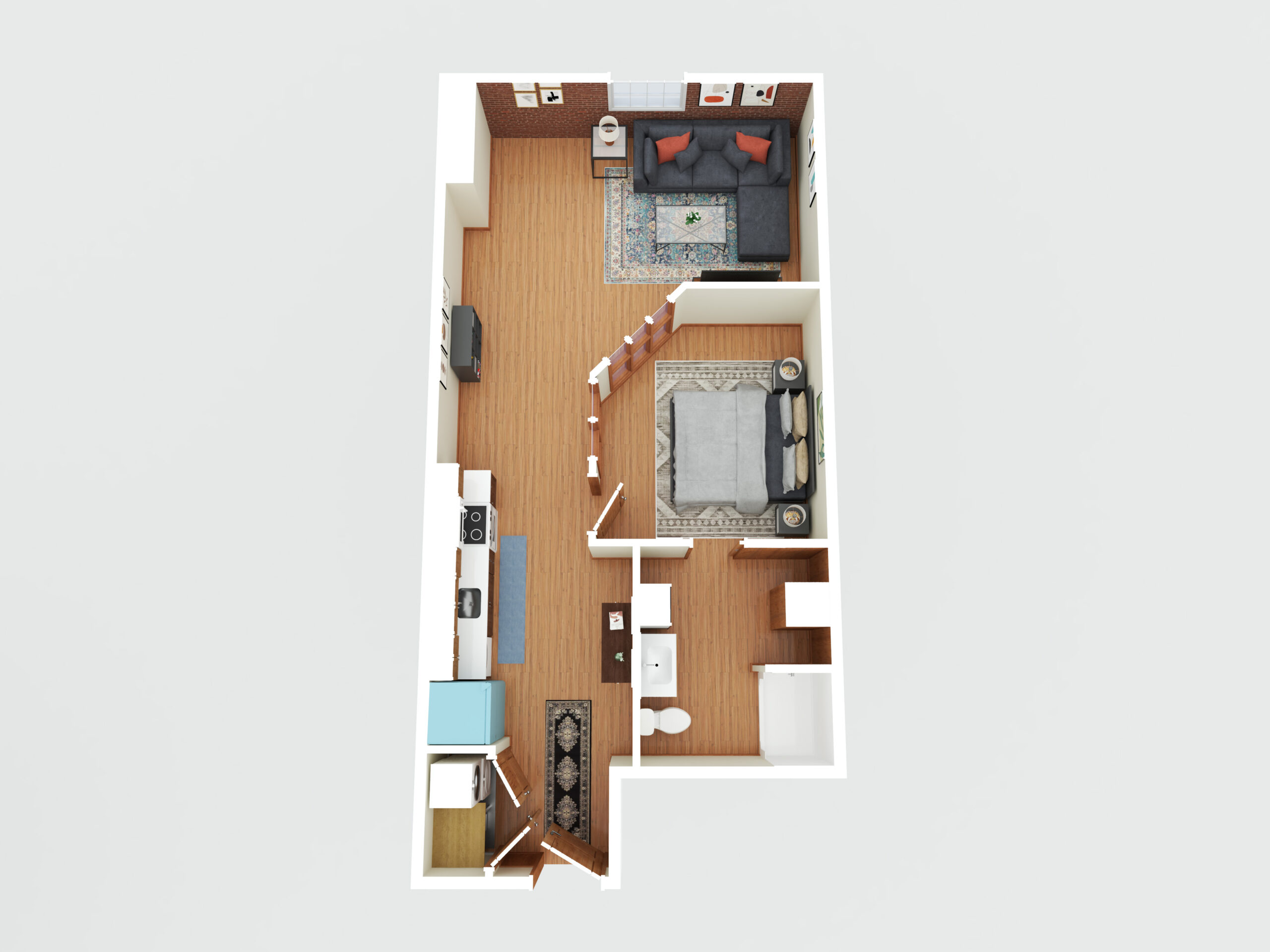 Beautiful high, lofted ceilings with views of Court Square. The bathroom has a solar tub and the living room has a skylight for lots of natural light! Let me not forget about the gorgeous brick wall in the living room wall!