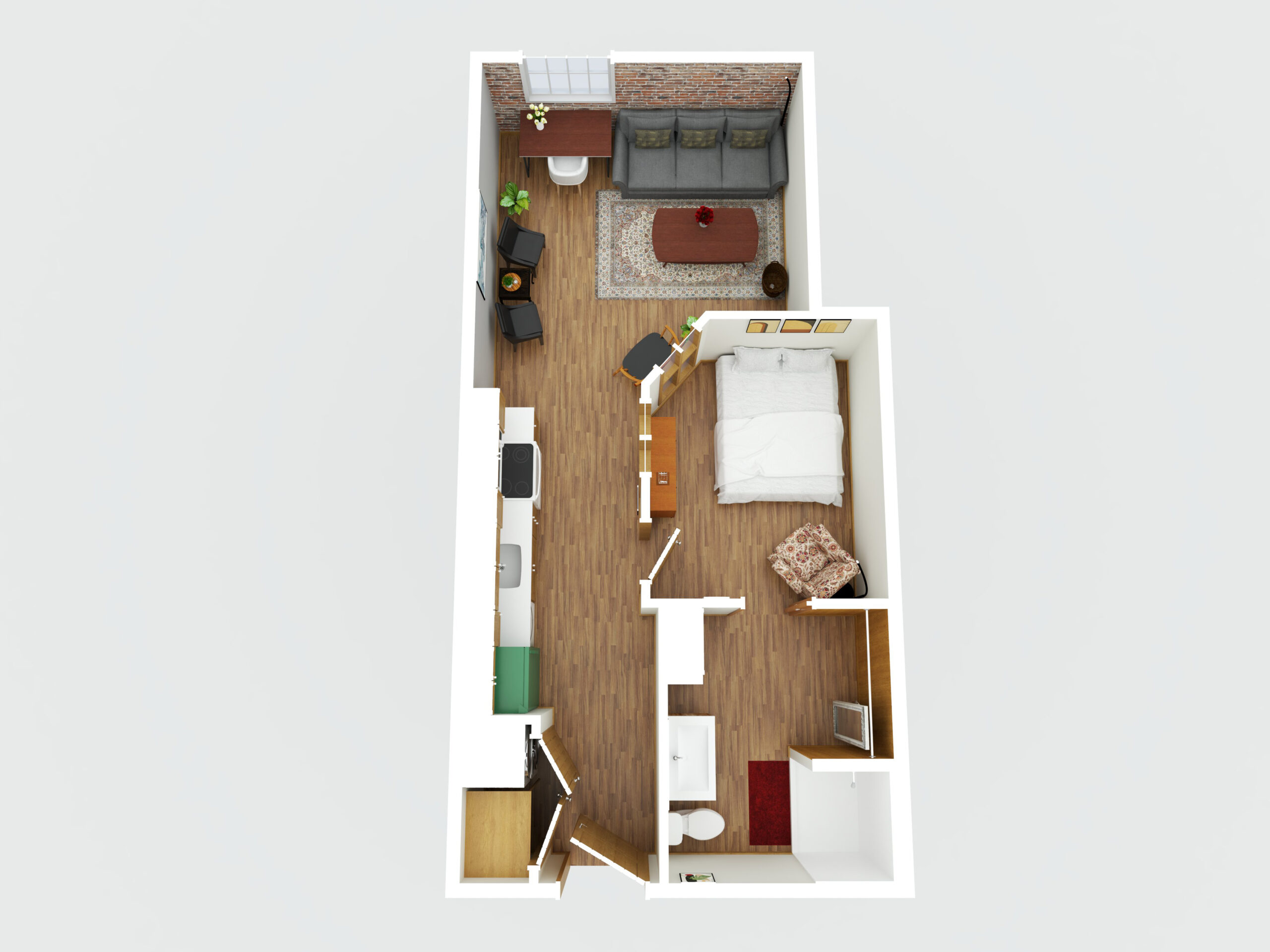 This apartment faces West. Great views of the sunset! This living room will feature a skylight and a brick wall. The bathroom will feature a solar tube for plenty of light; even on dark days.